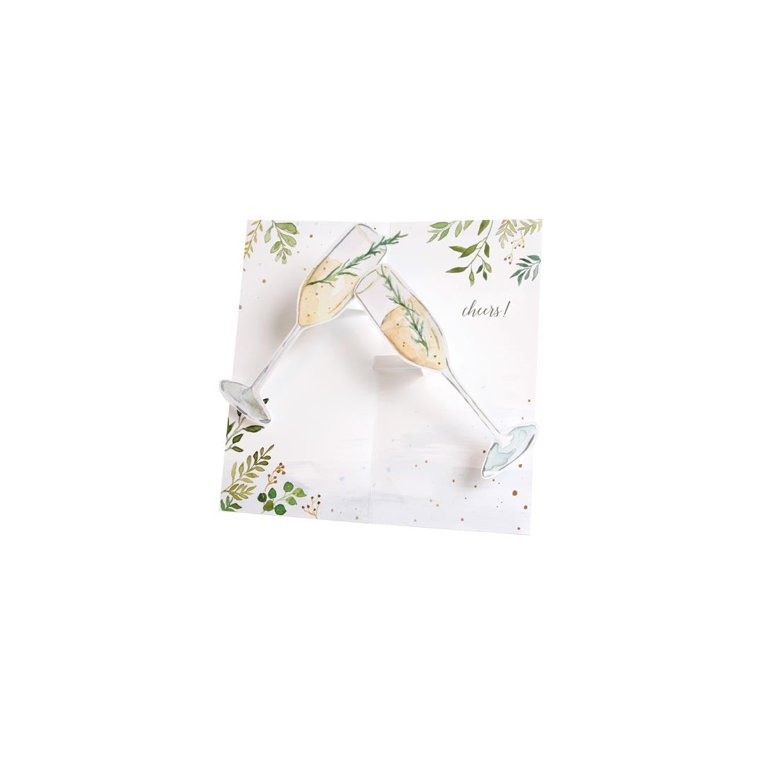 The Pure Alchemy Collection features cheeky salutations and pop-ups mixed with intricate laser-cutting. Two glasses of champagne clink together, flanked by foliage.